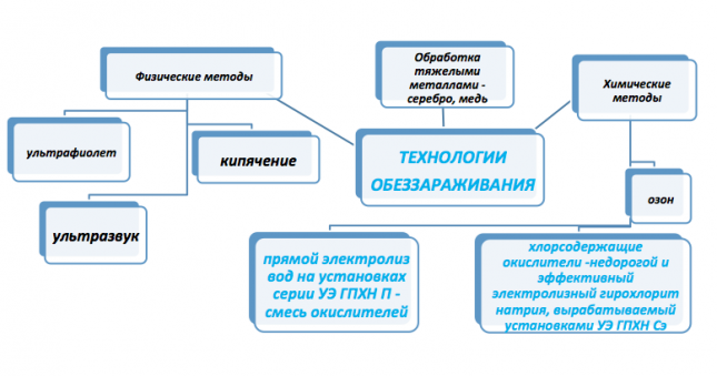На рисунке выше представлены основные технологии, применяемые для обеззараживания хозяйственно-питьевых вод. Исходя из экономической целесообразности наиболее широкое применение нашли: